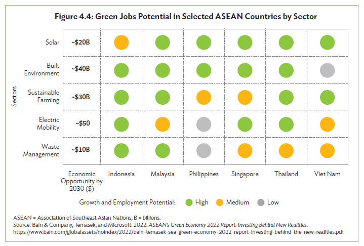 亞洲開發銀行(ADB)研究報告利用 Figure 4.4 詳盡分析了不同產業在綠色轉型中的增長潛力。這份潛力圖譜揭示了高就業與高產值的核心賽道。