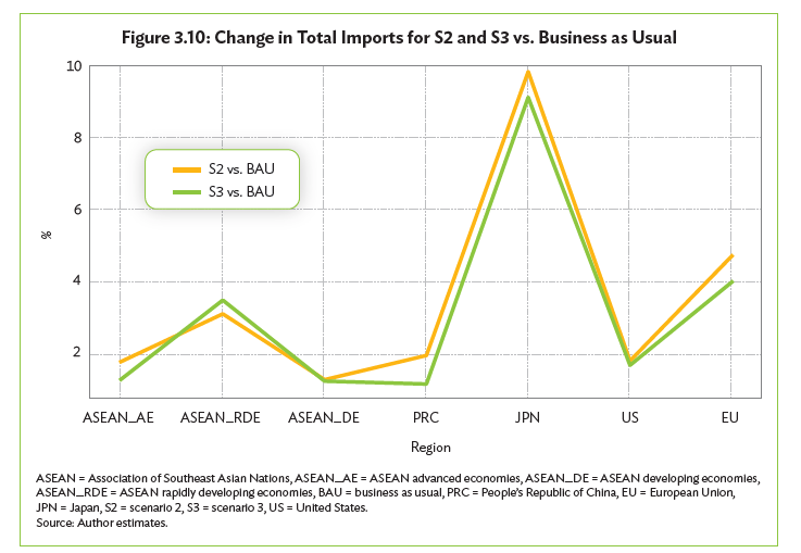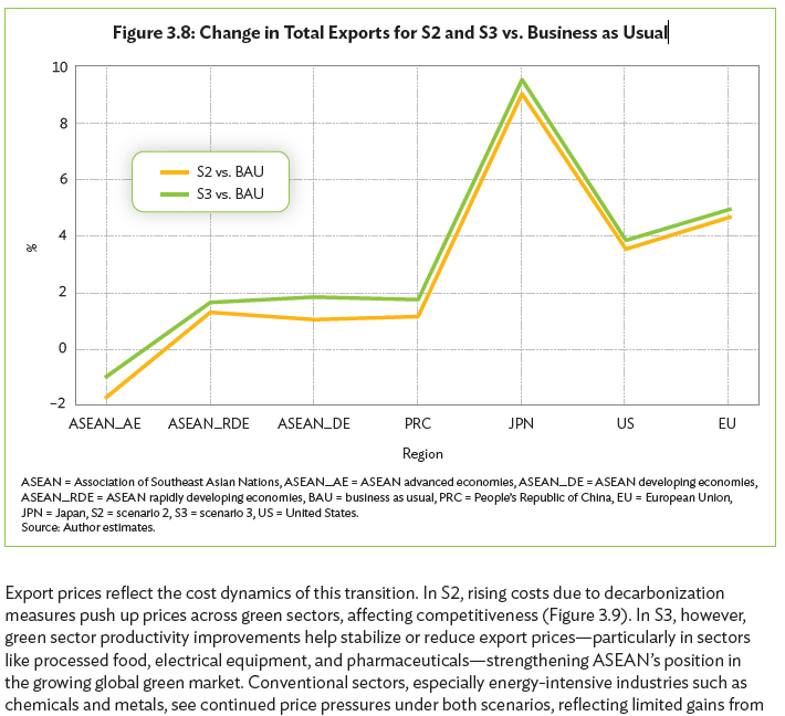面對綠色轉型,許多台灣中小企業的老闆常陷入「資金、人才與商模不知從何著手」的困境。內部缺乏整合碳盤點與財務成本的人才,導致許多人認為轉型只會拖累出口。亞洲開發銀行(ADB)報告透過情境模擬(Figure 3.8)直接破除了這個迷思。