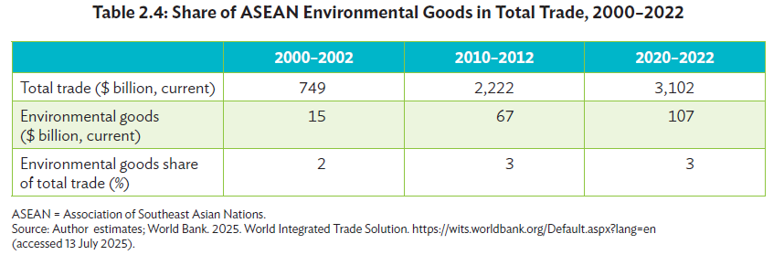 根據亞洲開發銀行(ADB)報告中的長期追蹤(Table 2.4),東協地區環境相關商品的貿易額在過去二十年間並非線性增長,而是呈現指數級的跨越。