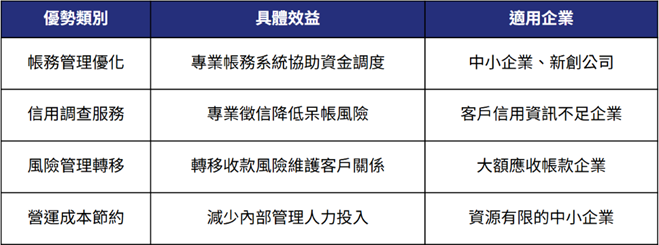 .營運成本大幅節約: 將帳務管理、信用調查、風險承擔等相關事務交由專業機構處理,對中小企業而言可減輕許多心理負擔,專注拓展公司業務,同時省去不少非必要的管理支出。