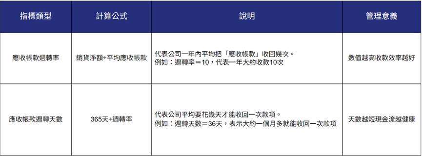 應收帳款累積金額過大或延遲收款期間過長,可能造成企業呆帳風險,同時也會增加資金調度困難。因此,掌握應收帳款的回收效率成為企業財務管理的重要課題。評估應收帳款管理效率需要運用量化指標,以下介紹2種指標的公式算法: