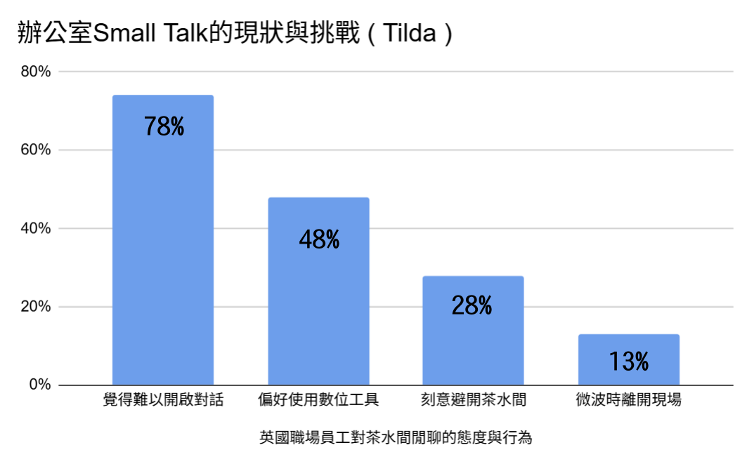 商周的報導指出,英國一項針對2000名在職成年人的研究,發現有74%的員工表示難以在茶水間、電梯內和同事展開輕鬆對話。更有一半的受訪者坦言,儘管同事座位相近,他們更傾向使用電子通訊軟體來回訊息,而不是面對面溝通。