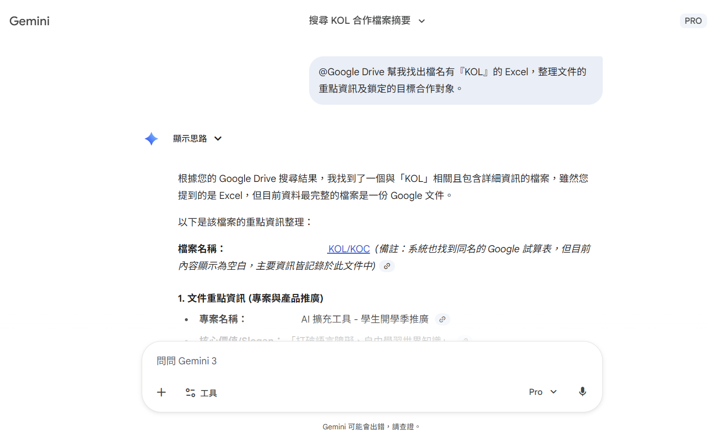 2.範例指令:「@Google Drive 幫我找出檔名有『2025 預算』的 Excel,並對照 @Gmail 中財務長寄來的『審核建議』,幫我列出需要修改的三個重點。」