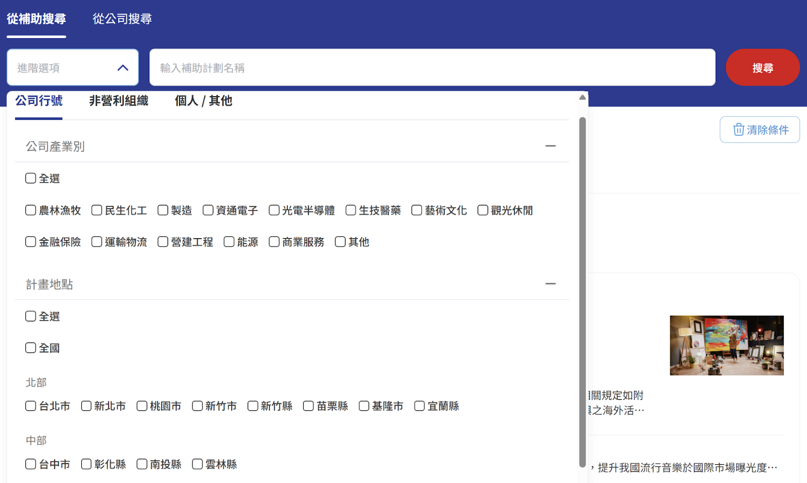 2.點擊篩選器的【進階選項】下拉式選單,可針對「補助團隊類型」、「計畫地點」等內容進行搜尋。