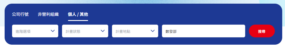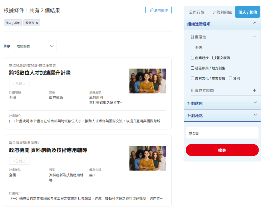 1.若需搜尋數位發展部的個人補助資源,可點選組織類別→【個人 / 其他】,並輸入關鍵字「數發部」,點選搜尋後即可出現相關補助內容。