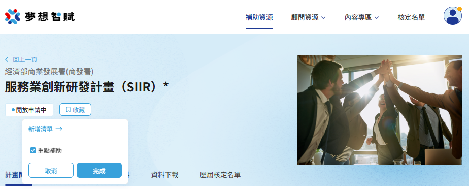 1.建立多個清單收藏並管理不同類別的補助計畫,補助資訊、計畫狀態不漏接。