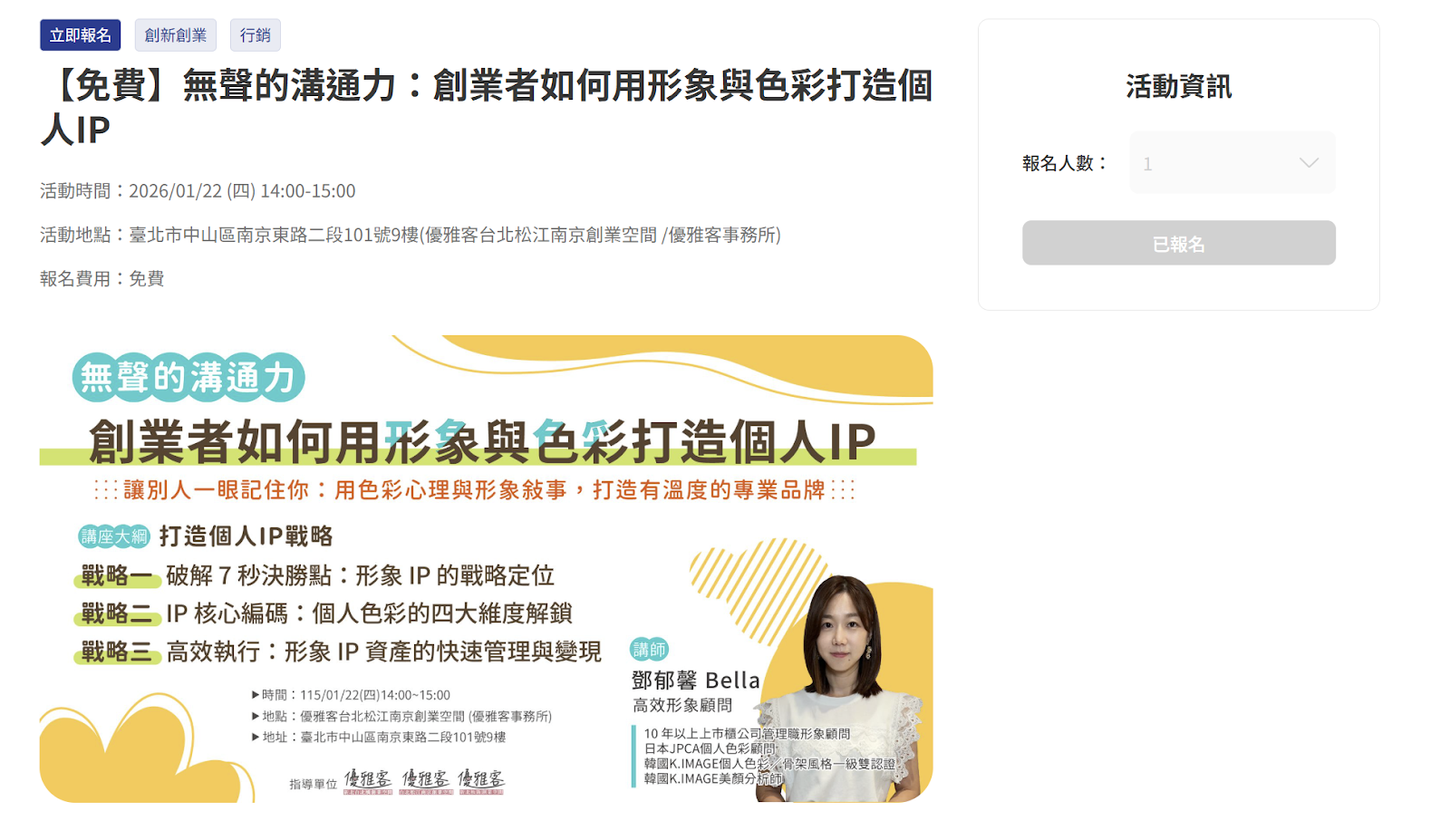 活動完成報名後,活動頁面的報名按鍵會反灰,代表已完成報名。