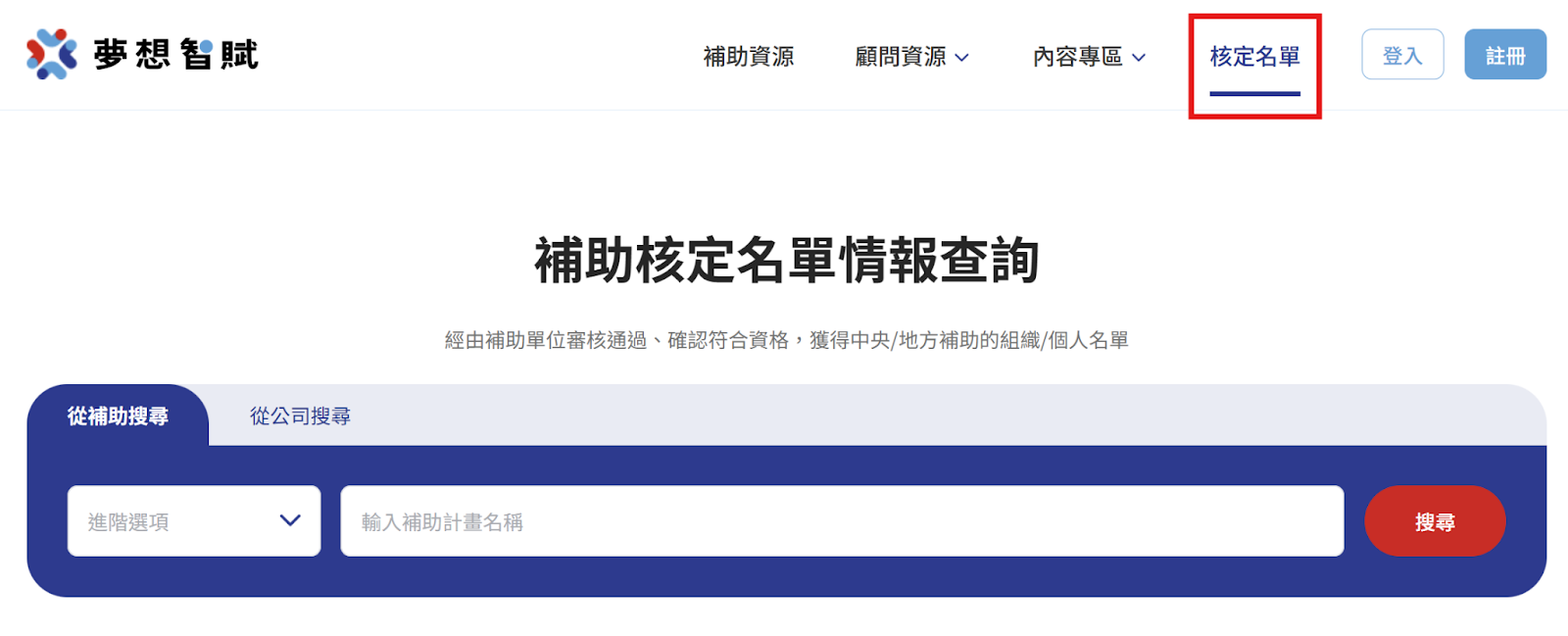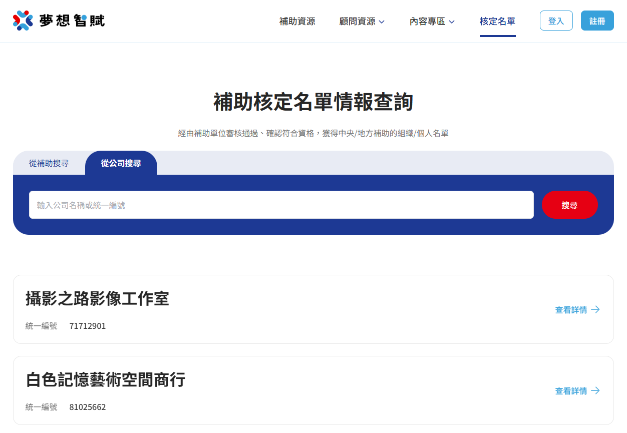 2.使用核定名單情報查詢功能,查看補助歷年的核定名單,或是查詢和自己相似的公司組織,為自己制定補助申請策略。