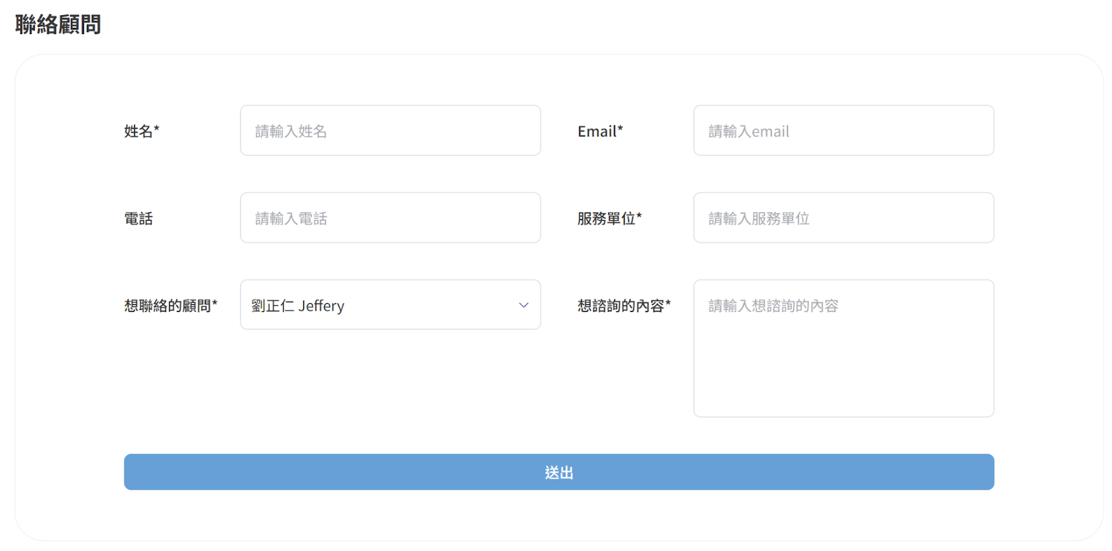 3.請依需求回覆表單,填入 姓名 / Email / 電話 / 服務單位 / 選擇想連絡的顧問 / 想諮詢的內容。